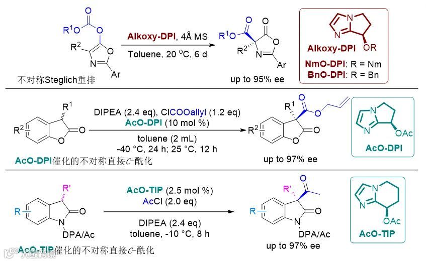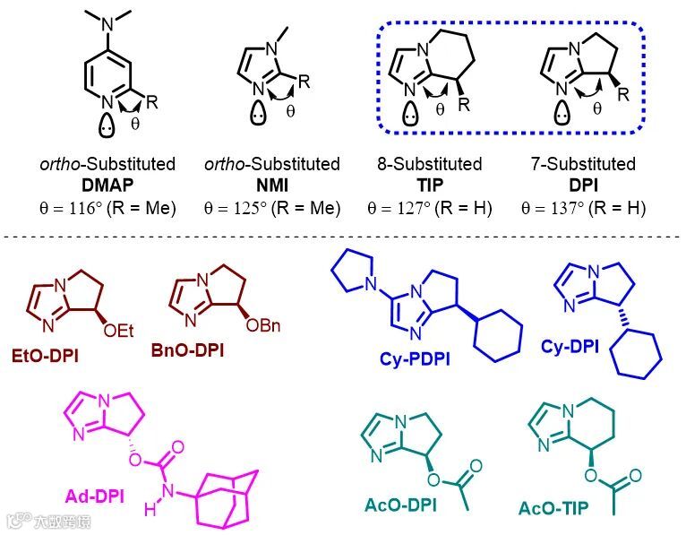 一般情况下,手性叔胺催化剂结构中手性控制基团离催化活性位点越近,催化反应的立体选择性越高;而催化活性位点周围的空间位阻越小,催化剂活性越高。为了解决这个互相矛盾的两难问题,张万斌课题组提出了一种全新的“键角调控”策略(图2),设计了新型双环咪唑结构来增大叔胺催化剂中亲核氮原子邻位的键角,从而提高催化剂活性的同时保持较高的立体选择性。相较于几乎没有催化活性的邻甲基DMAP结构(键角116°)和具有一定活性的邻甲基NMI结构(键角125°),咪唑并哌啶结构TIP催化剂具有较大的127°键角而咪唑并吡咯结构DPI催化剂具有更大的137°键角。这两类催化剂DPI和TIP都可从简单原料方便地合成,很容易从结构中的羟基与咪唑环位置进行各种衍生,从而进一步提高催化活性与立体选择性。