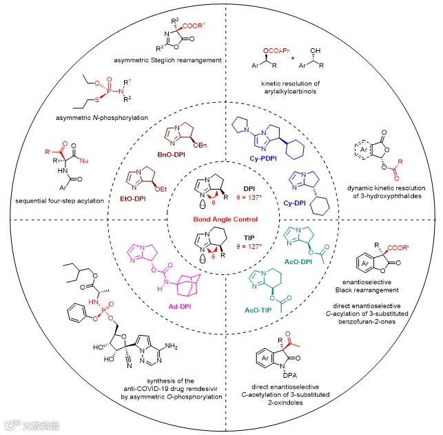手性双环咪唑催化剂的出现为有机小分子催化增添了一抹亮色。在系统的理论分析和实验研究基础上,张万斌课题组致力于通过催化剂分子结构角度因素的变化调控催化体系的活性和选择性,基于“键角调控”策略开发了系列基于双环咪唑骨架的中心手性有机小分子催化剂DPI和TIP,并不断拓展其在不对称催化合成领域的应用,以突破磷(V)手性中心高效构建等关键技术瓶颈,解决瑞德西韦等具有重要社会需求手性分子的高效合成难题。