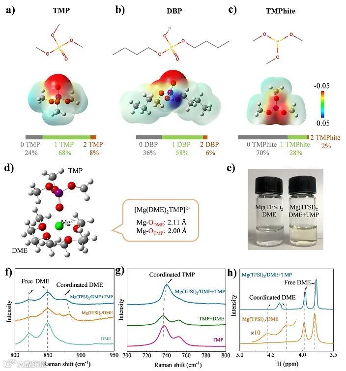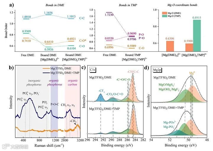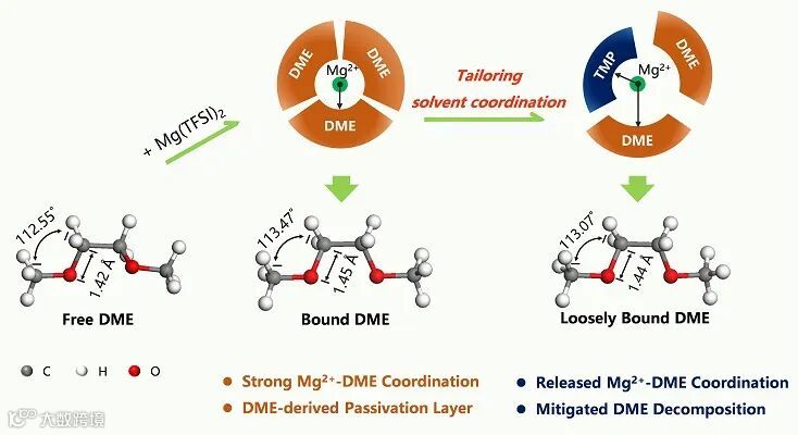 基于此认识,作者引入了含强极性磷-氧价键的有机磷分子作为电子对给体,与碳-氧键竞争与Mg2+的配位位点,削弱了其与DME的配位作用,使溶剂分子的构型得以恢复,热力学上也回升至相对稳定的状态。
