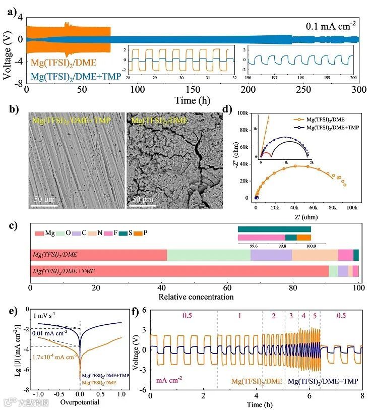 如前文所述,由于离子-溶剂配位作用所形成的溶剂化结构会对电极/电解液界面组分和后续的电化学性能产生深远影响。为此,作者通过理论计算评估了溶剂化分子中不同键价的键级变化,并借此预测了还原反应可能的断键位点与相应的分解组分,结果与拉曼(Raman)、XPS测试相吻合:界面上属于DME分解组分大大减少,TMP分解组分占主导,重排后的溶剂化鞘分解出有机/无机含磷组分。值得一提的是,Mg3(PO4)2等无机磷盐的带隙宽度很大,因此在保障界面电子绝缘性上有潜在的作用。从电化学性能上看,经过离子-溶剂配位环境调控的镁负极在过电位和循环寿命上均有显著提升,对称电池能够在较低的极化下实现长达600周的稳定循环。