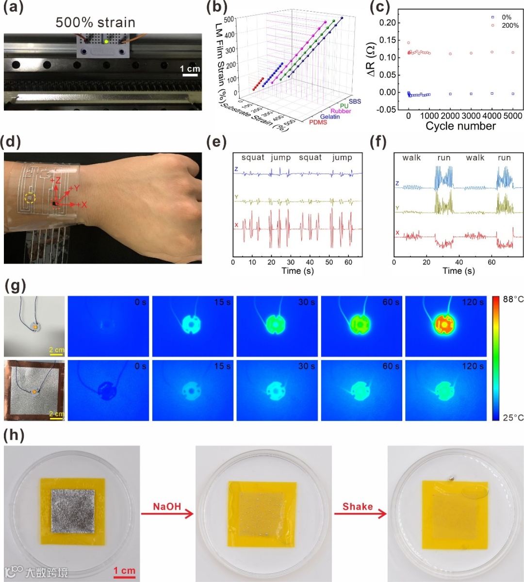 该液态金属薄膜具有良好的机械稳定性,对各种基底都有较强的粘附作用。在未封装的情况下,基底被拉伸时,液态金属薄膜随之同步形变,薄膜没有出现损坏、脱落、液态金属泄漏等问题,仍保持良好的导电性能。经过五千次的应变为200%的拉伸-释放循环,液态金属薄膜的导电性基本没有发生变化。可见,该液态金属薄膜具有良好的机械性能和导电性能,是设计和制备柔性可穿戴器件的理想柔性导体之一。由于液态金属的流体性质和高导热性,该液态金属薄膜还可用作柔性可拉伸的均热和散热界面,应用于柔性器件的散热。器件产生热量可以在液态金属薄膜的平面内快速扩散,进而拥有更大的散热面积,实现高效散热。即使在弯曲和拉伸状态下,该液态金属薄膜仍具备良好的热传导性能和散热效果。不仅如此,该液态金属薄膜还可回收利用。