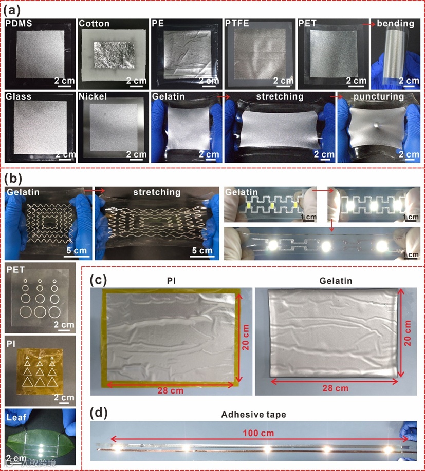由于明胶凝胶粘接层的存在,该方法可以将液态金属和图案均匀沉积和铺展到各种类型的基底上,包括:塑料薄膜、织物、金属薄膜、玻璃、树叶等。该方法还可以制备尺寸为280 mm × 200 mm的大面积液态金属薄膜,以及长度达到1000 mm的液态金属导电胶带。