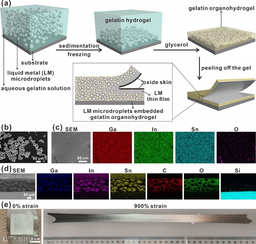 研究团队提出了一种明胶凝胶辅助的液态金属液滴沉积方法,利用明胶凝胶调控液态金属微米液滴的沉积和烧结,在各种基底上制备了粘附性强、导电和导热性高、机械性能优异的大面积液态金属薄膜和图案,并展示了其在柔性器件、散热界面等方面的应用。