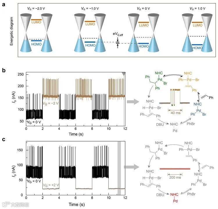 图1. 栅极电压调控的单分子钯催化Mizoroki-Heck偶联反应示意图