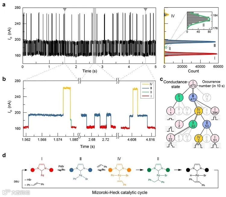 郭雪峰课题组、莫凡洋课题组与合作者首先将氮杂卡宾-钯配合物通过共价键连接到了具有纳米间隙的石墨烯点电极间,然后通过设计实验确定了连接配合物的催化活性以及单分子器件的成功构筑。莫凡洋课题组利用人工智能为高效准确地分析单分子平台测得的高精度数据,编写代码实现了对电流态种类的确定以及电流态转换的统计(图2a‒c)。再结合电流态的归属实验,他们实现了对Mizoroki-Heck偶联的原位实时监测以及反应路径的可视化(图2d)。