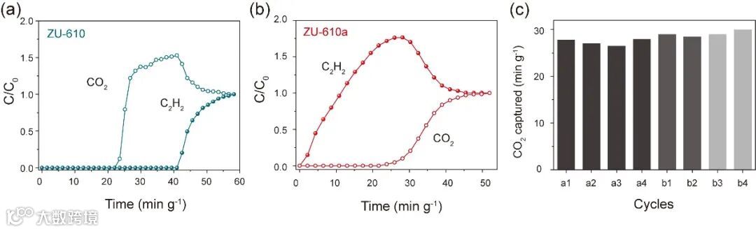 图2. ZU-610和ZU-610a的乙炔/二氧化碳混合气动态分离性能和循环性能