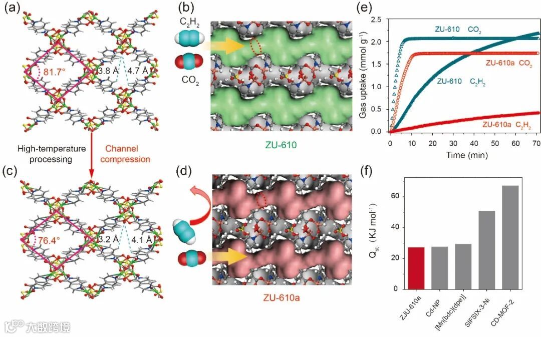 图1. 磺酸阴离子杂化多孔材料ZU-610和ZU-610a的结构示意图以及二氧化碳和乙炔吸附动力学曲线、二氧化碳吸附热