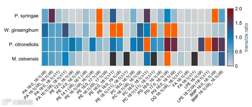 基于这种全新的分析手段,他们以植物的病原菌和内源菌为研究对象,第一次实现了组学层面上细菌的脂质双键异构体的全面分析。共鉴定出309个脂质分子,其中多达133个不饱和脂质实现了深度的双键异构精确鉴定。通过全面比较不同细菌中反式异构体和顺式异构体的比例(图2),发现了每种细菌独特的脂质异构指纹谱,揭示了细菌中特有的高比例反式脂质成分及其亚类分布规律,为进一步研究不饱和脂质异构体的生物功能奠定了基础。