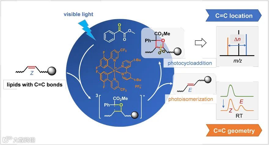 图1. 利用可见光催化双功能反应体系实现脂质双键异构体分析示意图