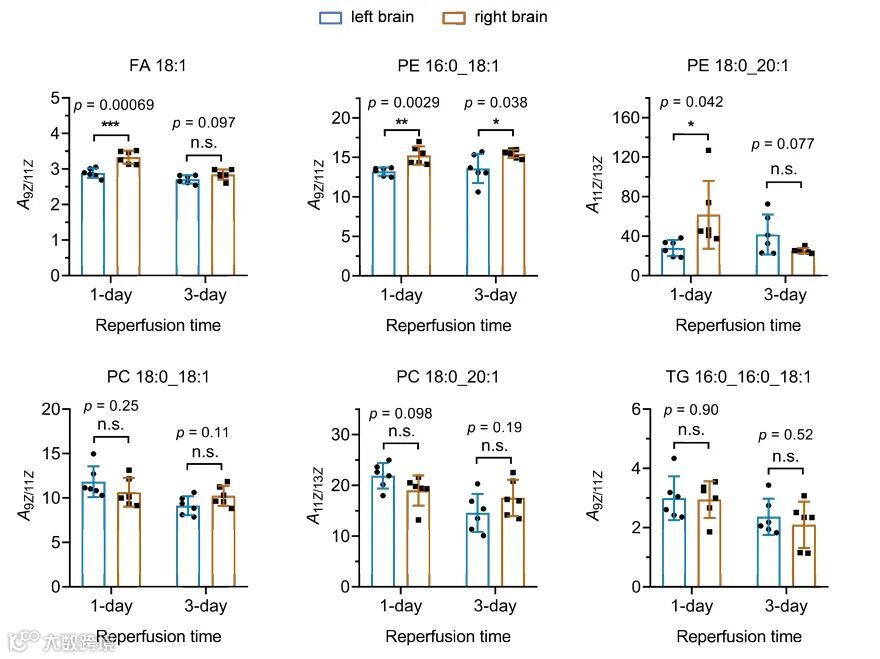 此外,他们还利用开发的不饱和脂质异构体分析方法,对小鼠脑缺血及其再灌注恢复过程中的脂质异构体比例进行了定量分析(图3)。首次发现脑缺血会导致脂肪酸(FA)和磷脂酰乙醇胺(PE)双键在9位和11位以及双键在11位和13位的异构体比例发生显著性变化,而再灌注恢复过程会使其得到显著改善。说明C=C位置异构体的生物合成受到了脑缺血的显著影响,再灌注过程可使其得到改善,可能与这些过程中不饱和脂类的代谢重编程有关。