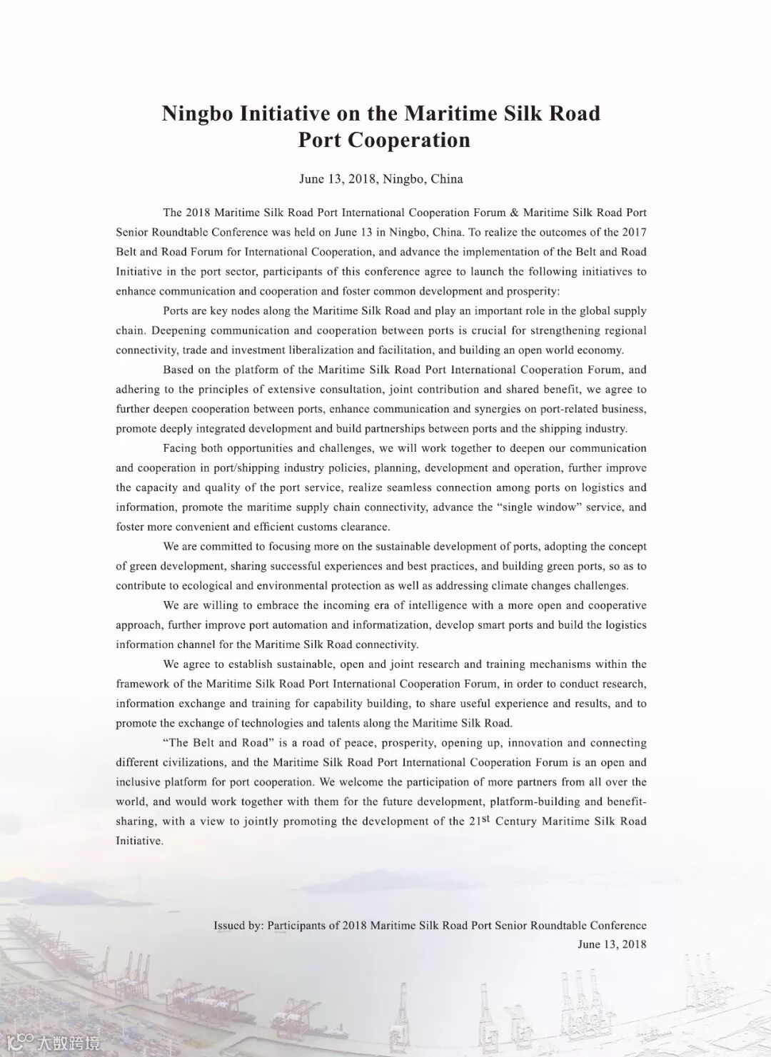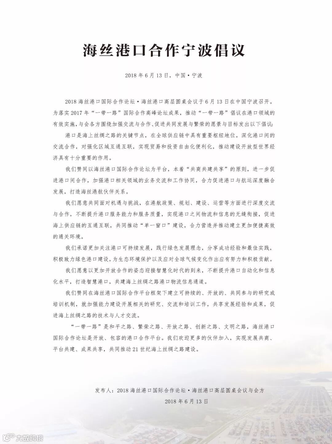 6月13日,海丝港口高层圆桌会议在宁波召开。该圆桌会议为2018海丝港口国际合作论坛高级别会议,旨在加强“一带一路”沿线港口合作,打造海丝港航伙伴关系。来自“一带一路”沿线的30家国内外港口企业、港务管理机构、码头运营商及中外政府部门的高层齐聚一堂,共商“一带一路”港航合作大计。会上,与会代表共同表达了推动“一带一路”倡议在港航领域有效实施的愿望,通过了《海丝港口合作宁波倡议》(以下简称《宁波倡议》),并就如何落实《宁波倡议》内容、合作共推“一带一路”港航发展提出了构想。