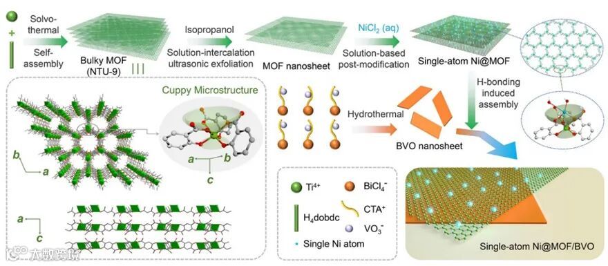 图1. 单原子Ni@MOF/BVO异质结光催化剂的合成路径。图片来源:Adv. Mater.