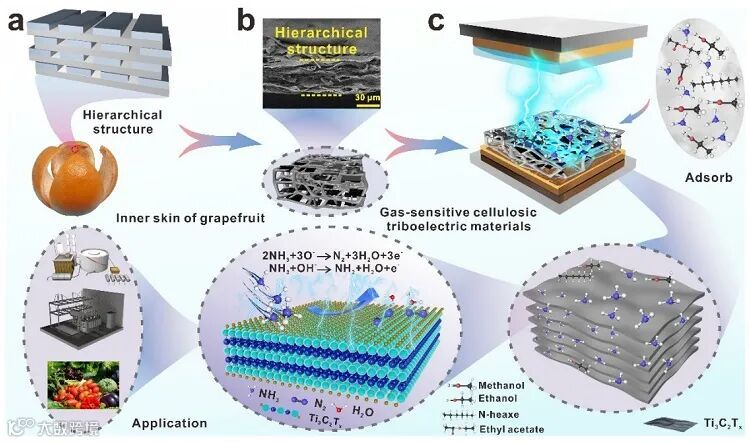 图1.纤维素摩擦电材料用于自供电气体传感。