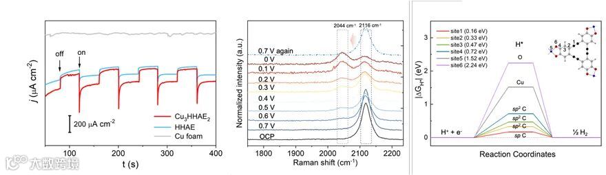Cu3HHAE2作为光阴极在0 V(相对于可逆氢电极(RHE))时显示出高达260 µA cm-2的优异光电流密度,这是无共催化剂有机光阴极中最高值的之一(图2)。电化学原位共振拉曼光谱以及密度泛函理论(DFT)模拟进一步揭示了C≡C键是催化光电化学(PEC)水分解的高活性中心。