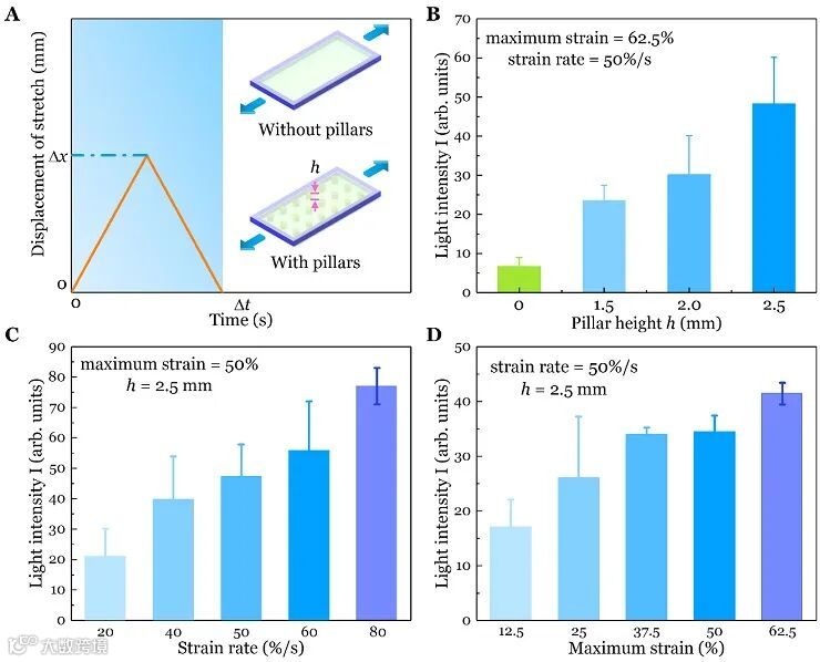 首先,作者探究了弹性体空腔的内部结构设计对发光强度的影响。如图3A所示,第一种设计具有平坦的内表面,而第二种设计在空腔内部引入了微柱。在相同的力学测试下,光强随着微柱高度h的增加而增加,归因于较高的微柱增强了内部流体的扰动,从而增大了剪切力(图3B)。此外,光强分别随着应变率或应变的增加而增加,可归因于流场中存在更显著的剪切力(图3C-D)。