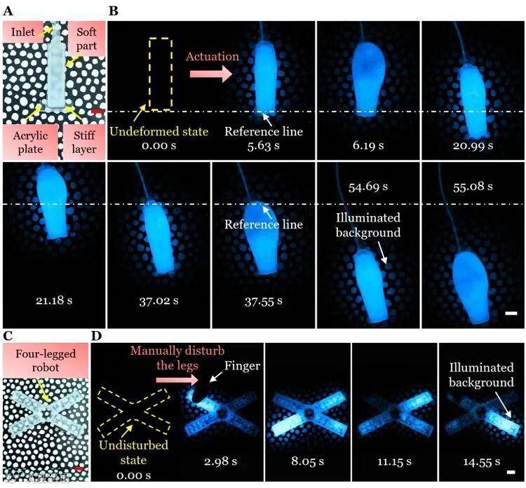 在本部分,作者展示了力致发光机器人可在主动驱动或被动扰动下,发出亮光以用于环境照明。作者设计了一个爬行机器人,并将其放置在斜面上(图5A)。在黑暗中,由于甲藻溶液的液压驱动,机器人循环变形从而在斜坡上向前爬行,并发出亮光用于照明(图5B)。然后,作者设计了一个四足类软体机器人(图5C),并将甲藻溶液封装在四条腿中。在黑暗环境中,由于手指的按压,受到扰动的腿发出亮光并照亮周围环境,而其他腿保持相对黑暗(图5D)。