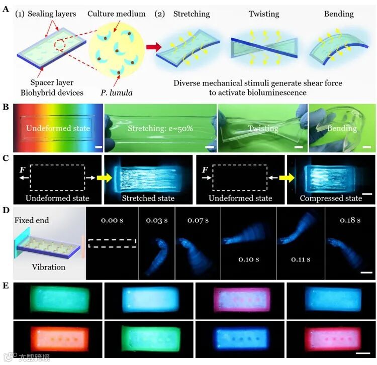 如图2A所示,作者使用透明的弹性体空腔封装甲藻细胞(P.lunula)溶液来制造生物融合器件。该甲藻对环境条件具有较高的耐受性,在全球海洋中广泛分布。P.lunula在光照下进行光合作用,产生氧气并储存能量。在黑暗环境中,当该器件受到力学刺激时,封装在内部的溶液发生扰动,从而产生剪切力激活甲藻固有的生物发光。该器件高度透明(图2B),允许太阳光和生物光的自由穿透。同时,该器件柔软可变形,在外界载荷作用下可保持结构稳定(图2B)。作者还展示了该器件在拉伸、压缩和自由振动下的发光行为(图2C-D)。作者进而将彩色染料与弹性体溶液混合制作空腔,实现了对发光光谱的调节,拓展了颜色范围(图2E)。