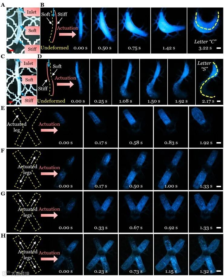 在本部分,作者展示了通过编程机器人的变形模式,实现不同的发光图案,以用于黑暗中的光学信号传递。作者设计了单向弯曲的软体致动器(图6A),在甲藻溶液的液压驱动下,软体致动器弯曲变形,并显示出字母“C”(图6B)。作者进而串联了两个单向弯曲致动器(图6C),在液压驱动下,两部分向相反方向弯曲,并显示出字母“S”(图6D)。最后,基于图5C中的设计,作者以不同顺序驱动四条腿,实现了不同的发光图案用于信号传递(图6E-H)。
