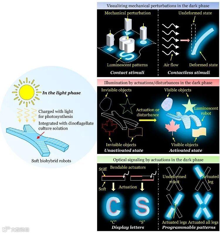 图1. 生物融合力致发光软体机器人的工作原理及其在黑暗环境中的潜在应用