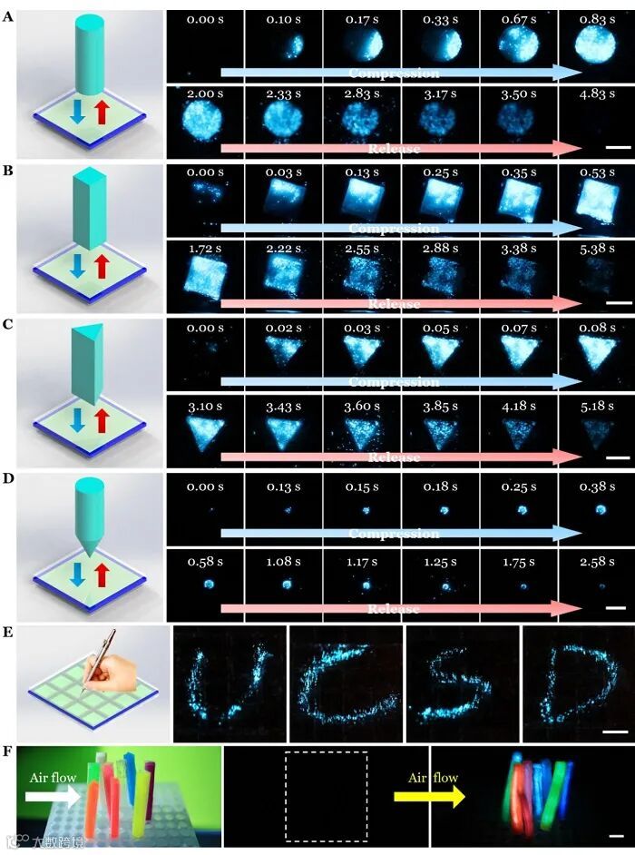 图4. 通过接触式和非接触式刺激激活力致发光器件,以用于外部力学扰动的可视化