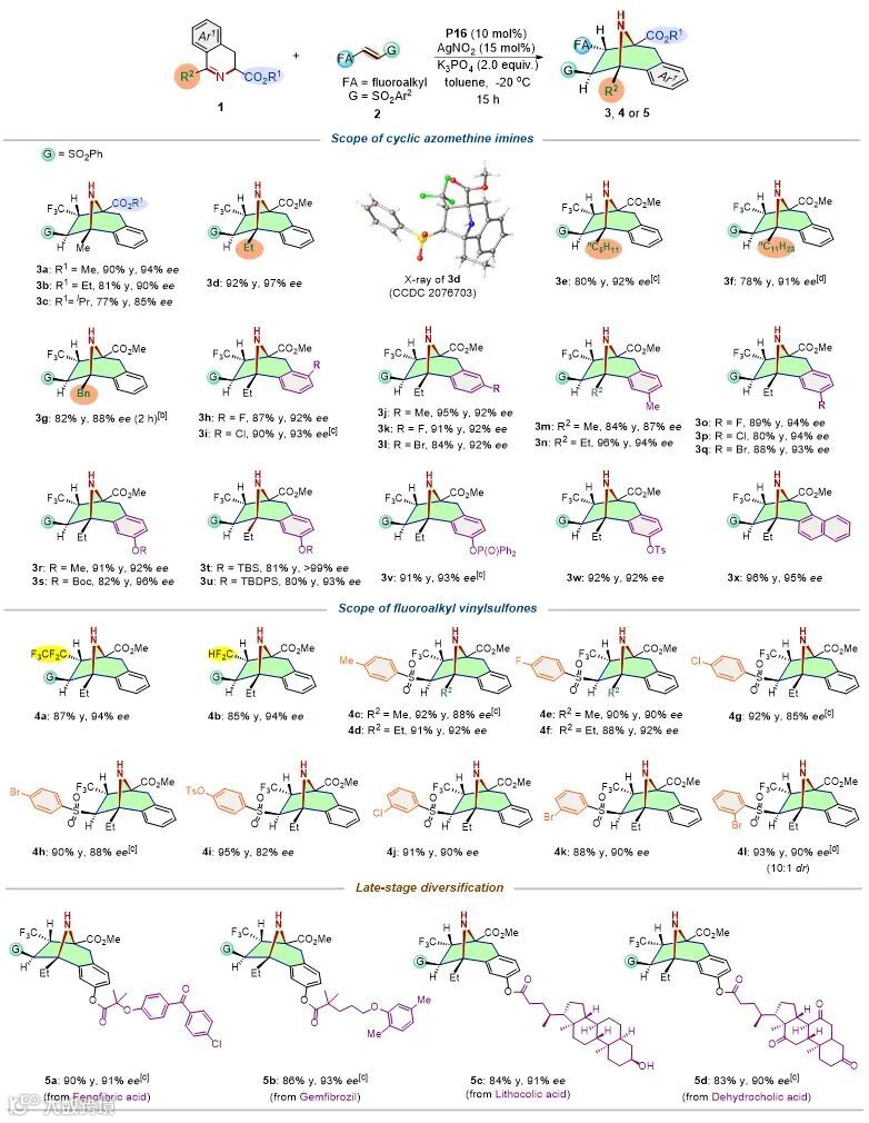 以手性二肽季鏻盐-亚硝酸银作为共催化剂,实现了环状亚胺化合物与α-氟代烷基烯烃的不对称偶极环化反应,精准构建了一系列含氟手性托品烷衍生物。