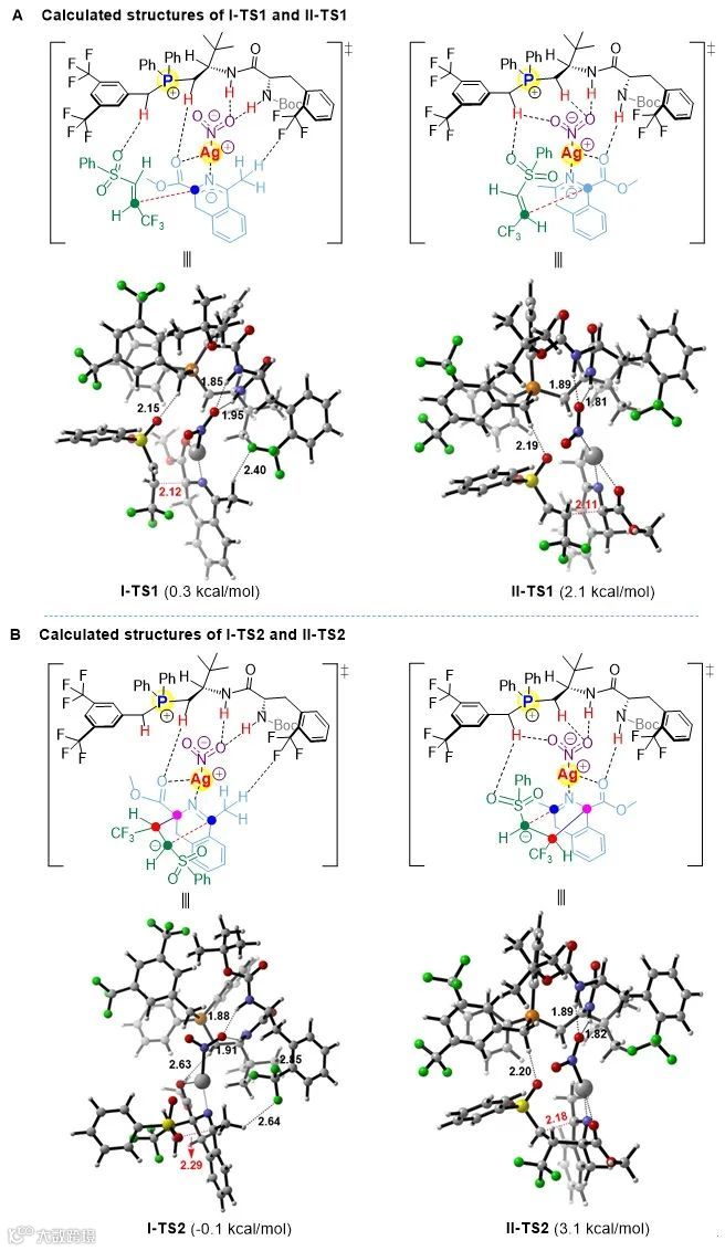 教授合作,通过DFT计算证实了手性肽季鏻盐与亚硝酸银之间通过氢键作用“绑定”,银配位活化环状亚胺,同时季鏻盐催化剂与环状亚胺和氟代烯烃之间还分存在弱键作用。由此,该反应通过类似于“三明治”的夹心模型进行 (图 4)。