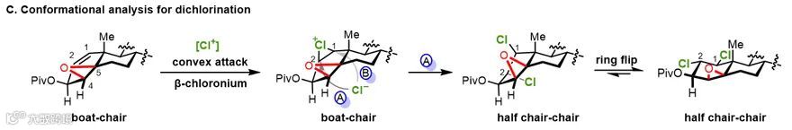 ,在原位产生的氯气作用下,为保持船式构象,将优先在凸面形成氯鎓中间体,接着另一分子氯负离子由位阻更小的C2位进攻氯鎓中间体构筑C1,C2位手性中心,生成双直立键二氯中间体,最后发生构象翻转得到双氯处于平伏键的稳定构象体。
