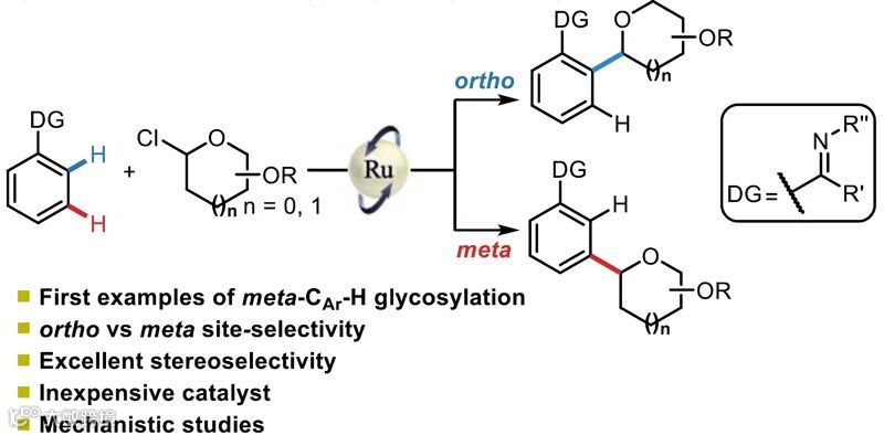 导读:梁永民课题组在Angew. Chem. Int. Ed.期刊上发表研究论文,利用钌催化的邻位C-H活化和σ-键活化策略,实现了芳烃选择性邻位和间位C−H糖苷化,并通过该方法合成了一系列C-芳基吡喃糖苷