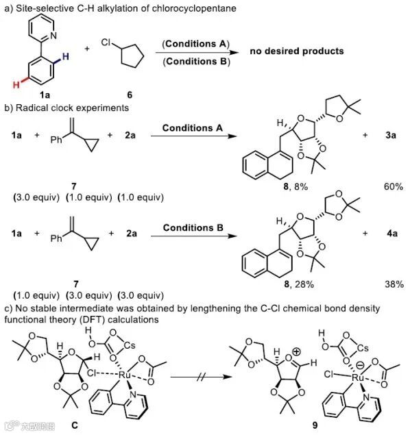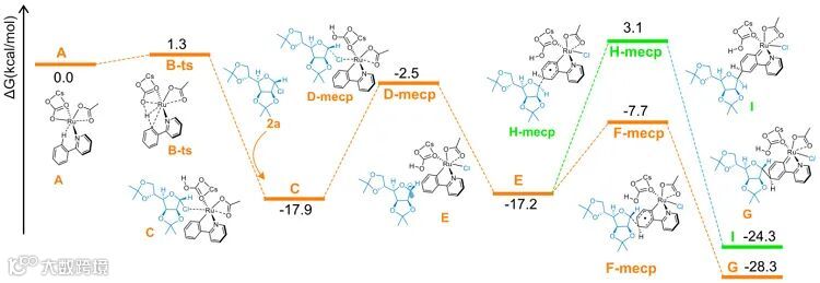 为了探究反应的机理,作者进行了一系列机理验证实验,包括动力学同位素效应(KIE)测定、自由基钟实验、密度泛函理论(DFT)计算等研究。其中,邻位C-H键糖苷化是经过氧化加成和还原消除的过程,而对间位的C-H糖苷化反应,DFT计算验证了反应是自由基过程,通过σ-活化策略获得目标产物,排除了碳正离子过程。并且DFT计算还表明,间位