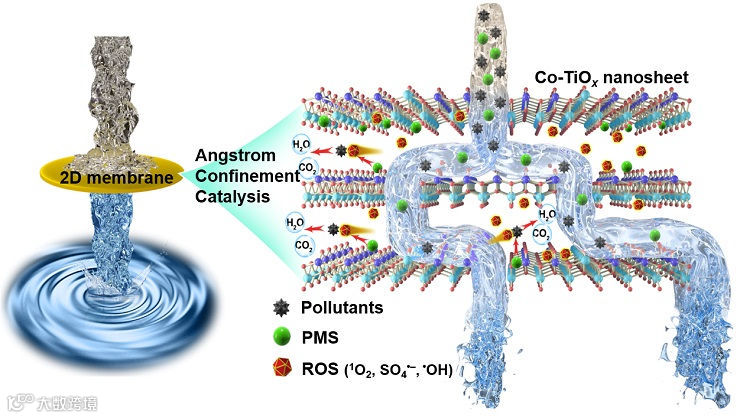近日,清华大学深圳国际研究生院张正华团队在Nature旗下的子刊Nature Communications 上发表研究论文,制备了二维钴晶格掺杂的钛氧化物(Co-TiOx)纳米片,并将其组装成具有多级层状埃米(4.6 Å)限域结构膜。研究结果表明,埃米限域空间内高效暴露活性位点,能加强对过一硫酸盐(PMS)的活化,产生强氧化自由基实现对目标污染物雷尼替丁的长效降解(100%)。有效降解速率高达1.06 ms-1,是传统非均相催化反应体系的105-7倍。此外,Co-TiOx 膜/PMS体系能实现对多种有机物的快速(膜保留时间<30 ms)高效降解。结合周期性密度泛函理论(DFT)、分子动力学(MD)以及第一性原理分子动力学(AIMD)计算结果分析,埃米限域空间催化不仅能促进PMS的分解,提升自由基的产率,而且能大大缩短自由基至目标污染物的迁移距离,保证自由基在半衰期内与污染物的有效接触,实现自由基的高强度、集约化的空间利用率,进而提高催化效率。此外,埃米限域空间能增强水分子与Co-TiOx之间的氢键作用力,促进分子在埃米限域通道内的快速传质,进而加快催化反应进行。研究发现膜法埃米限域催化的策略同样适用于其他二维材料膜。因此,该工作不仅揭示了埃米限域催化氧化高效快速去除水中有机污染物策略的重要性,也为推动高级氧化法水处理技术的发展提供新思路。