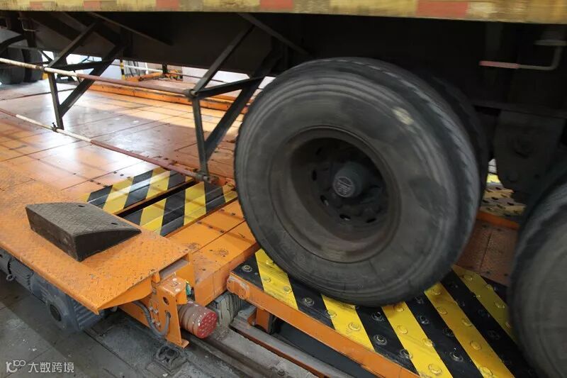 引导员将集卡车开至检测专用通道后,将轮胎准确停在检测卡扣上。