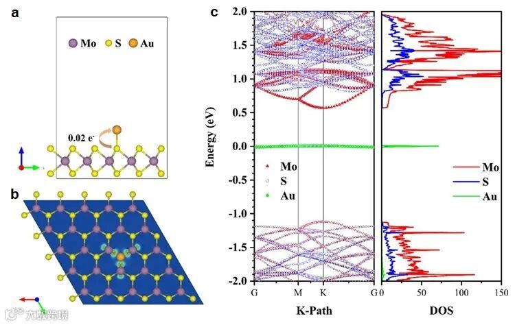 图2. sAu/MoS2 QDs的荧光效率增强机制。(a)最优的sAu/MoS2 QDs的结构侧视图;(b)sAu/MoS2 QDs的电荷密度差分图;(c)sAu/MoS2 QDs的电子能带结构和态密度(DOS)与能级之间的关系曲线图。图片来源:Angew. Chem. Int. Ed.