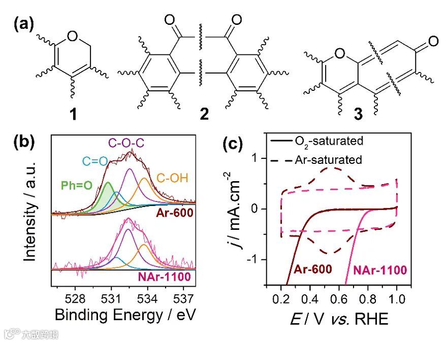 图3. (a) 碳基催化剂中色烯类物质(1)、醌类物质(2)、吡喃酮类物质(3)的示意图 (b) Ar-600(富含醌)和 NAr-1100(不含醌)催化剂的XPS O 1s光谱 (c) Ar-600(富含醌)和 NAr-1100(不含醌)催化剂的电化学行为
