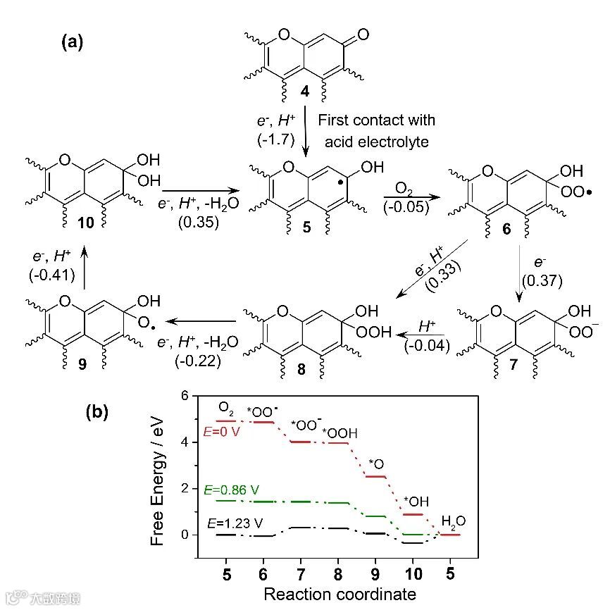 图4 .(a) 吡喃型催化剂上氧还原的反应机理 (b) 催化剂上四电子耦合ORR 的自由能图