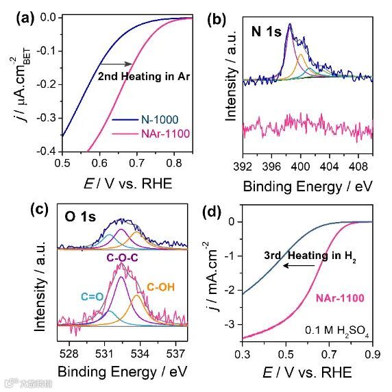图1. (a) 催化剂N-1000和NAr-1100(a)在氧饱和的0.1 M H2SO4溶液中的极化曲线(从BET测得表面积,用于归一化电流)(b) XPS N 1s光谱和 (c) XPS O 1s光谱 (d) 催化剂NAr-1100在1100 ℃氢气热处理前后的ORR活性。