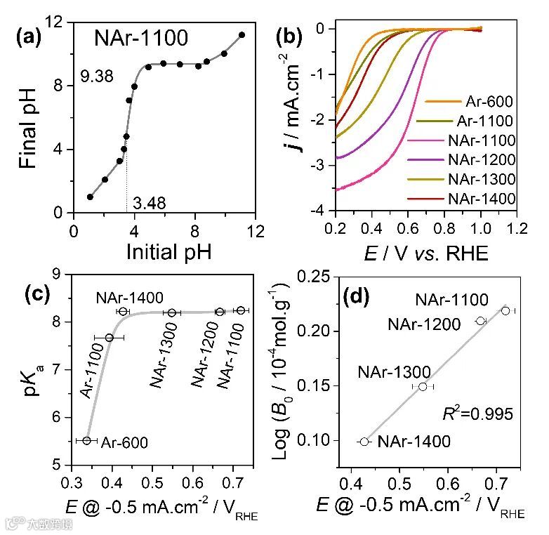 图2. (a) NAr-1100 催化剂的 Boehm 滴定曲线 (b) 在氧饱和的0.1 M H2SO4溶液中的极化曲线 (c) 氧掺杂催化剂的pKa与ORR活性关系图 (d) 两步热处理催化剂log(B0/10-4 mol/g)与-0.5 mA.cm-2处的电位关系图