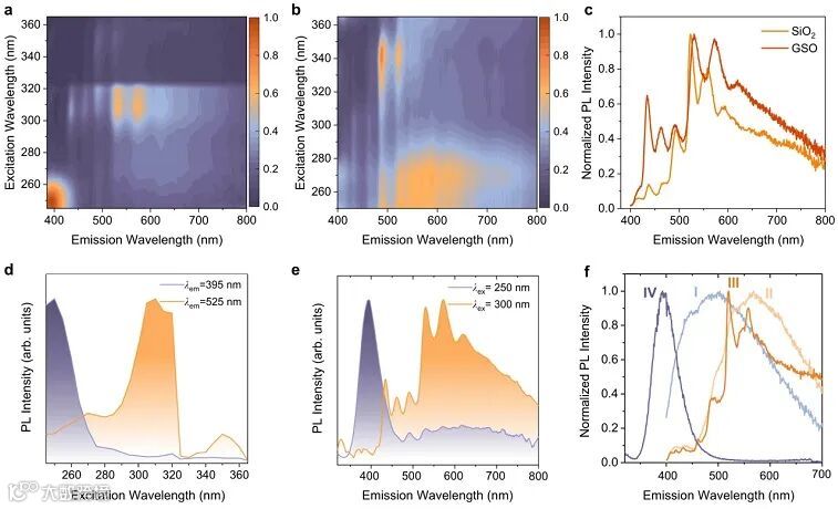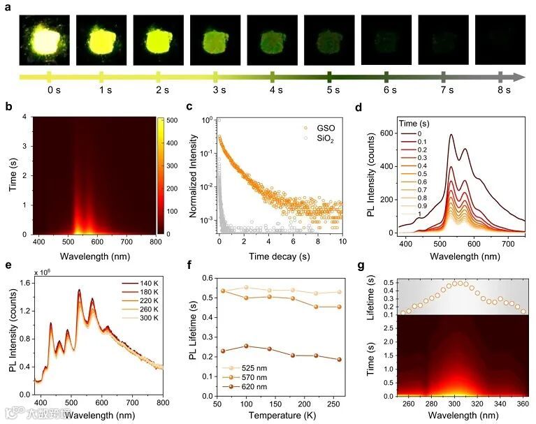 光学测试表明,在室温及低温条件下(≤ 300 K),通过改变激发光波长可以实现GSO在短寿命(~ 100 μs)的紫光发射和长寿命(~ 0.6 s)的黄光发射之间通过激发波长的变化进行自由切换(图2,图3)。这两种发射模式相对独立,无论是在激发还是发射区域都具有极小的重叠部分,这使得材料发光模式的变化很容易被人眼识别并加以区分。