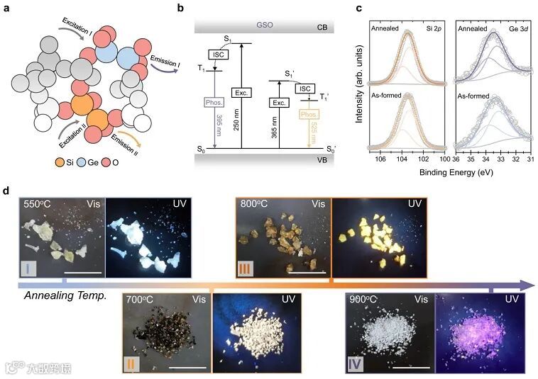 近日,中山大学化学学院杨振宇教授课题组与多伦多大学Edward Sargent教授课题组合作开发了一类同时具有室温长余辉磷光和高温下热激活延迟荧光特性的可控多彩显示硅锗氧化物(GSO)。通过受控的有机硅氧烷和有机锗氧烷的共水解过程及后续的高温烧结反应,制备得到具有硅锗发光中心均匀分散的无定形锗硅氧化物,其发光中心选择可以通过组分、浓度和激发波长进行调节(图1)。此外,通过不同发光中心之间的耦合作用,能够有效增强GSO中室温磷光发射特性,并以此建立基于常温和高温两种不同的能量转移通道,从而实现材料室温磷光和热激活延迟荧光的动态切换。