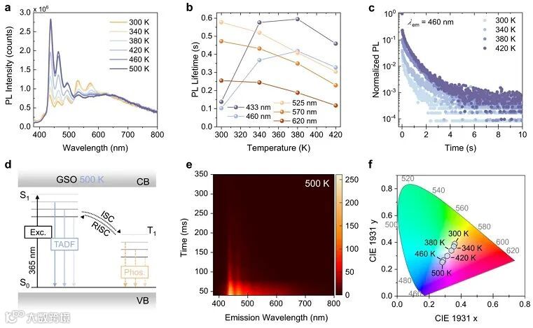 图4. GSO在高温条件下的热激活延迟荧光性质表征