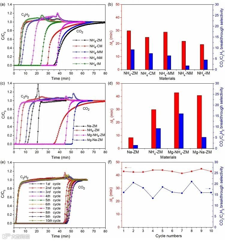 在动态穿透实验中,Mg-NH4-ZM从等摩尔的CO2/C2H2气体中可以选择性吸附CO2,几乎不吸附C2H2,选择性达到16.1,同时每单位体积的吸附剂可以产出43.9 cm3/cm3的纯C2H2。该材料具有高的循环稳定性,200度真空活化2 h后进行气体突破测试,10次循环,选择性和吸附量都没有降低。对其高温性能进行测试,Mg-NH4-ZM在60度条件下,仍然具有29分钟的分离时间和6.48的分离选择性。对高湿性能进行测试,含水量为18.12%时分离性能没有降低。与其他CO2选择性吸附剂相比,Mg-NH4-ZM具有仅次于MUF-16的选择性,同时C2H2纯化体积仅次于Cd-NP,而在60度条件下其性能优于MUF-16和Cd-NP。