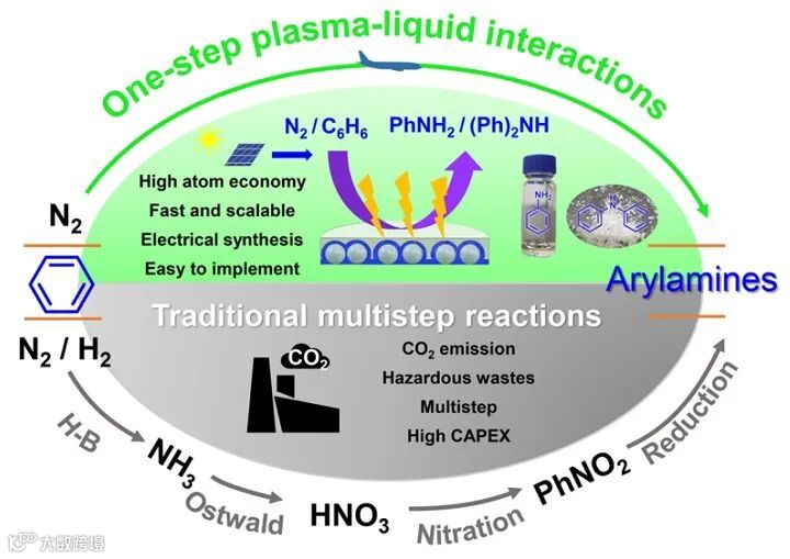 图3. 芳胺合成:传统多步骤路线和等离子体气液一步法对比。图片来源:Angew. Chem. Int. Ed.