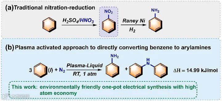 图1. 硝化-氢化的苯胺制备路线(a)和等离子体气液合成芳胺策略(b)。图片来源:Angew. Chem. Int. Ed.