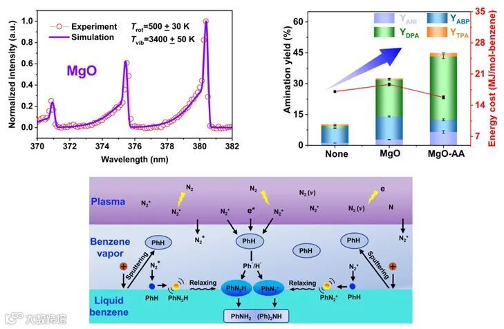 图2. 介质填充DBD等离子体的温度特征(左上)和介质填充/促进剂对胺化产率的提升(右上),以及氮等离子体与液态苯的反应过程示意图(下)。图片来源:Angew. Chem. Int. Ed.