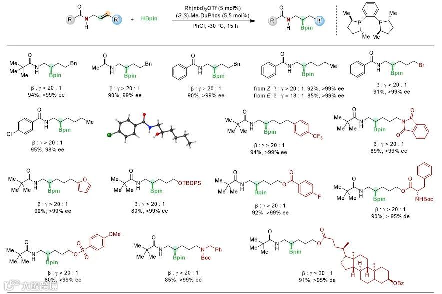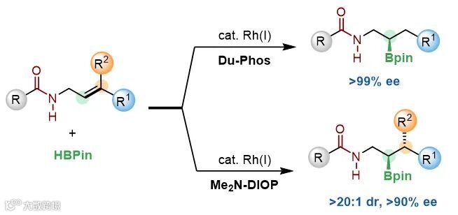 李必杰课题组开发了铑催化的酰胺导向非活化内烯烃的不对称硼氢化反应,该反应能够以高产率、高非对映选择性及高对映选择性构建β-手性胺和β,γ-手性胺类产物。该反应条件简单、高效,为氮原子远端手性中心的构建提供了新的思路。