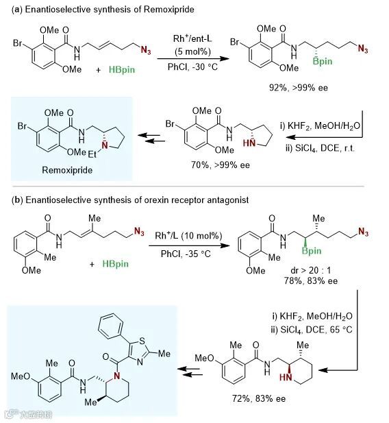 该反应在环状手性胺的合成中具有应用前景。利用Matteson等人报导的胺化方法,从二取代烯烃底物出发,经3步转化即可高效合成Remoxipride的核心骨架;从三取代烯烃底物出发可以合成得到六元环化合物,该化合物可作为食欲素受体抑制剂的合成前体(图4)。