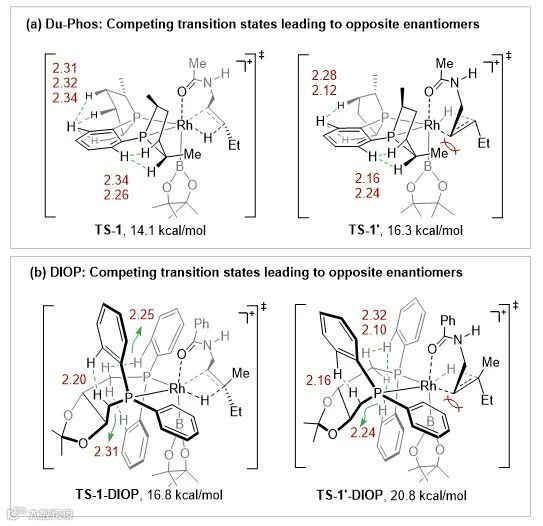 DFT计算表明,反应中Rh-H键的迁移插入是决定立体选择性的步骤。进一步分析迁移插入的过渡态结构,磷原子上取代基与底物之间的排斥是导致两种构型过渡态之间能量差异的主要原因(图5)。