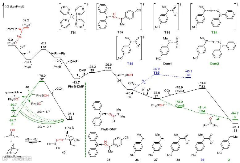 除此之外,通过DFT理论计算对反应的过程进行了研究(图5),结果显示表明在可见光照射下,四苯基硼钠(NaBPh4)和光催化剂经SET过程生成二苯基硼自由基(Ph2B•)。接着,Ph2B•与羟基(OH)配位形成B–O自由基络合物,然后苄基C−OH键的均裂形成苄基碳自由基。随后,苄基碳自由基与光催化剂经SET过程生成相应的苄基碳负离子,再与CO2反应,酸化后即得目标产物。溶剂DMF在反应过程中具有稳定硼自由基的作用。该工作展示了一种断裂醇羟基碳–氧键的新型反应模式,提供了一种直接转化醇类化合物的新方法。