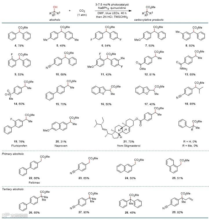 图3. 硼自由基活化苄基C−OH键:光氧化还原催化醇与CO2的还原偶联