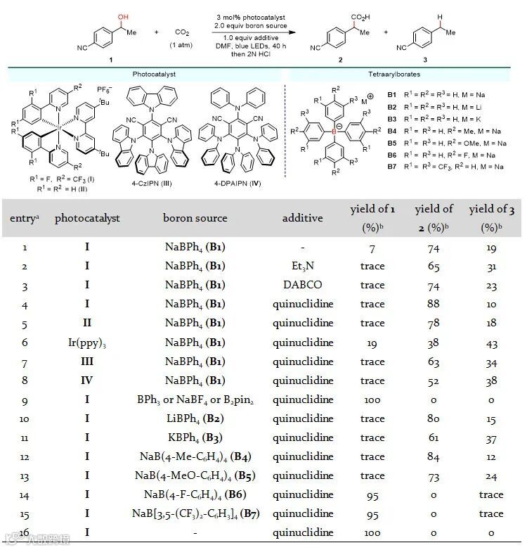 作者通过大量的条件筛选,确定了反应的条件:在可见光照射下,金属铱络合物或咔唑衍生物作为光催化剂、四苯基硼钠作为硼自由基前体,奎宁环作为碱,DMF作为溶剂。其中硼自由基前体对该反应影响比较明显。当使用BPh3,NaBF4,B2pin2,NaB(4-F-C6H4)4(B6)和NaB[3,5-(CF3)2-C6H3]4(B7)作为硼自由基前体时,反应不能发生。控制实验表明,光照、光催化剂、NaBPh4、二氧化碳都是反应发生所必需的,缺一不可(图2)。