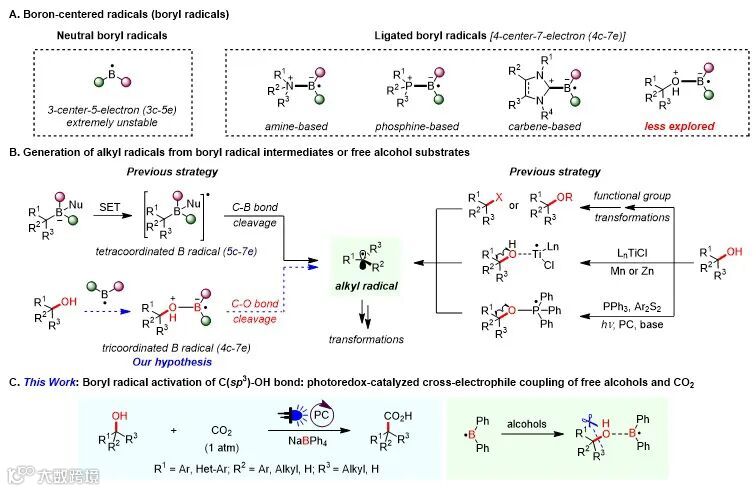 硼自由基作为一类具有独特结构和反应性能的活性物种,为多种化学键的高效构建和断裂提供了新的策略和途径。路易斯碱(如胺、膦、卡宾等)配位的4-中心-7-电子(4c-7e)型硼自由基(ligated boryl radical)相对稳定,其研究相对广泛。相比之下,3-中心-5-电子(3c-5e)的中性硼自由基(neutral boryl radical)极度缺电子,非常不稳定,极大的限制了其合成应用。醇类化合物作为简单易得的化工原料,直接选择性地转化醇羟基得到高附加值的化学品在合成领域尤为重要。事实上,醇的直接脱氧交叉偶联反应的最大挑战在于其C−O键解离能高(BDE ~ 96 kcal/mol),C−O键难以断裂。传统的方法是将醇羟基预活化为相对稳定的活性中间体,比如碳酸酯、黄原酸酯、草酸酯等,然后再断裂C−O键,实现新的转化。因此,开发温和条件下醇的直接碳−氧键断裂官能化的新方法和新策略很有必要。